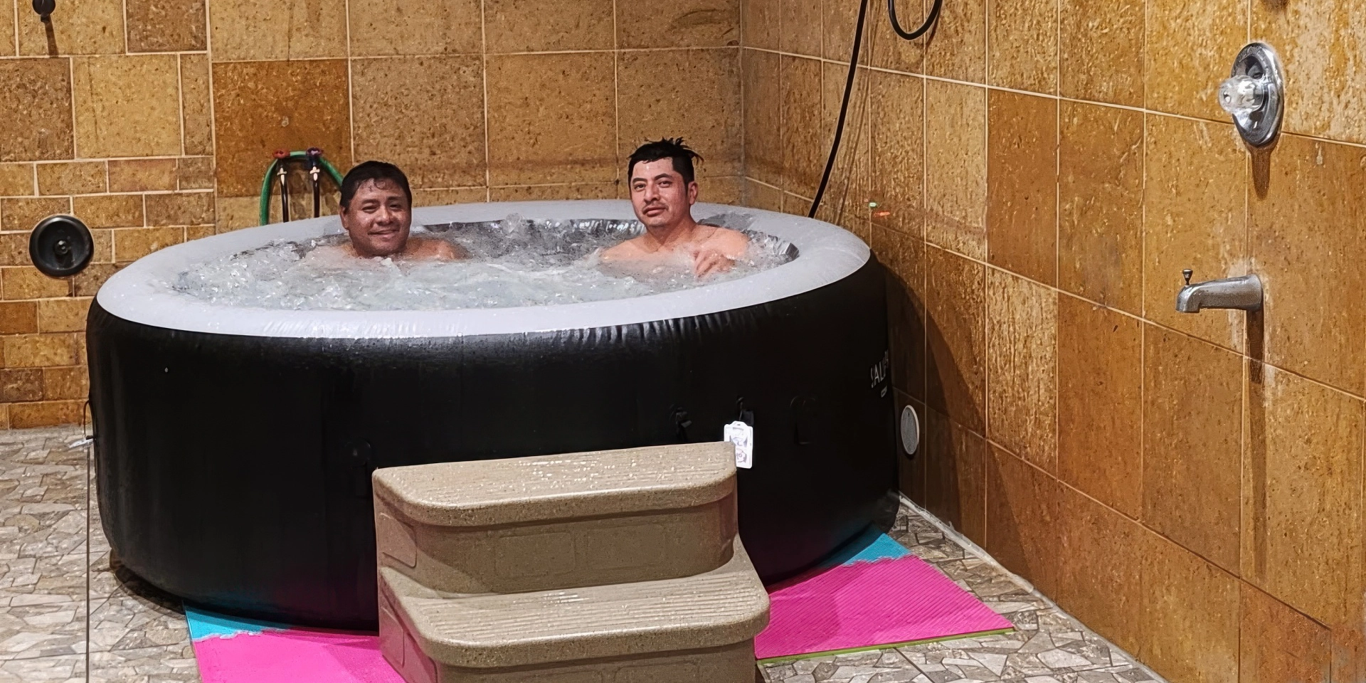Only men admitted inside to spa and sauna. Private lockers and towels provided.